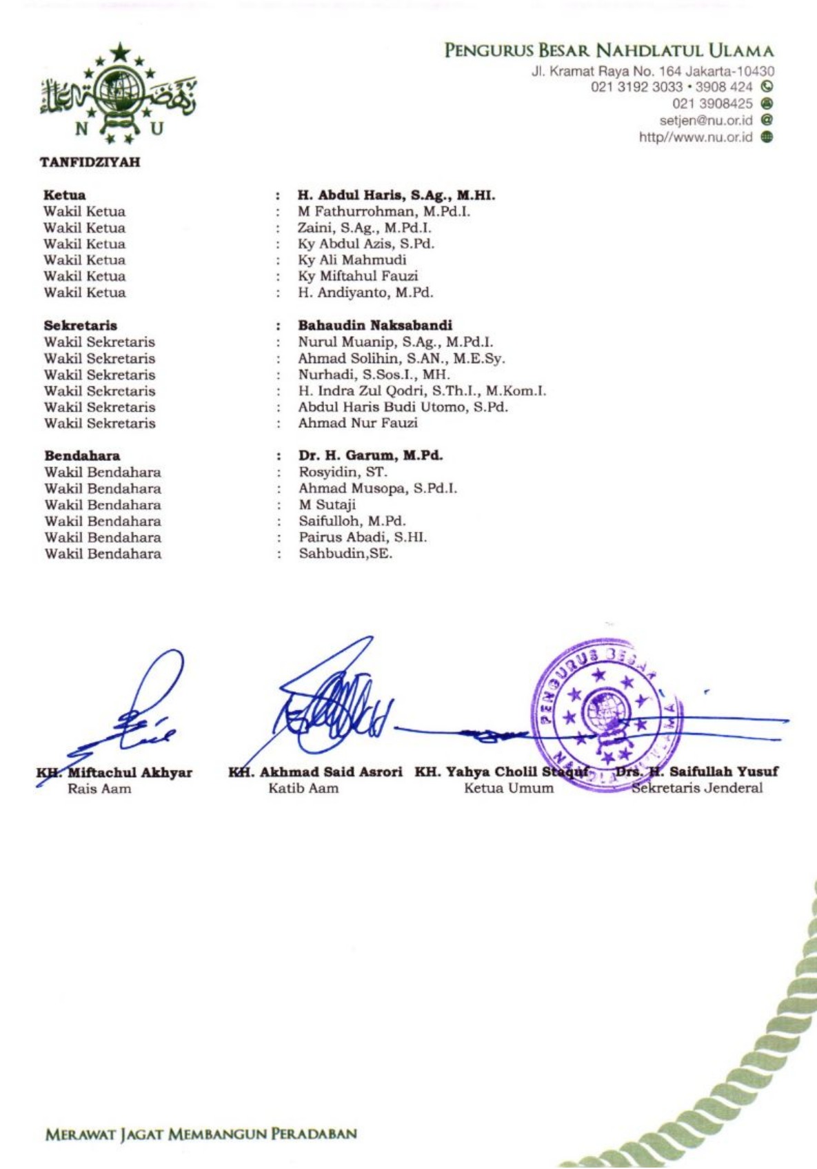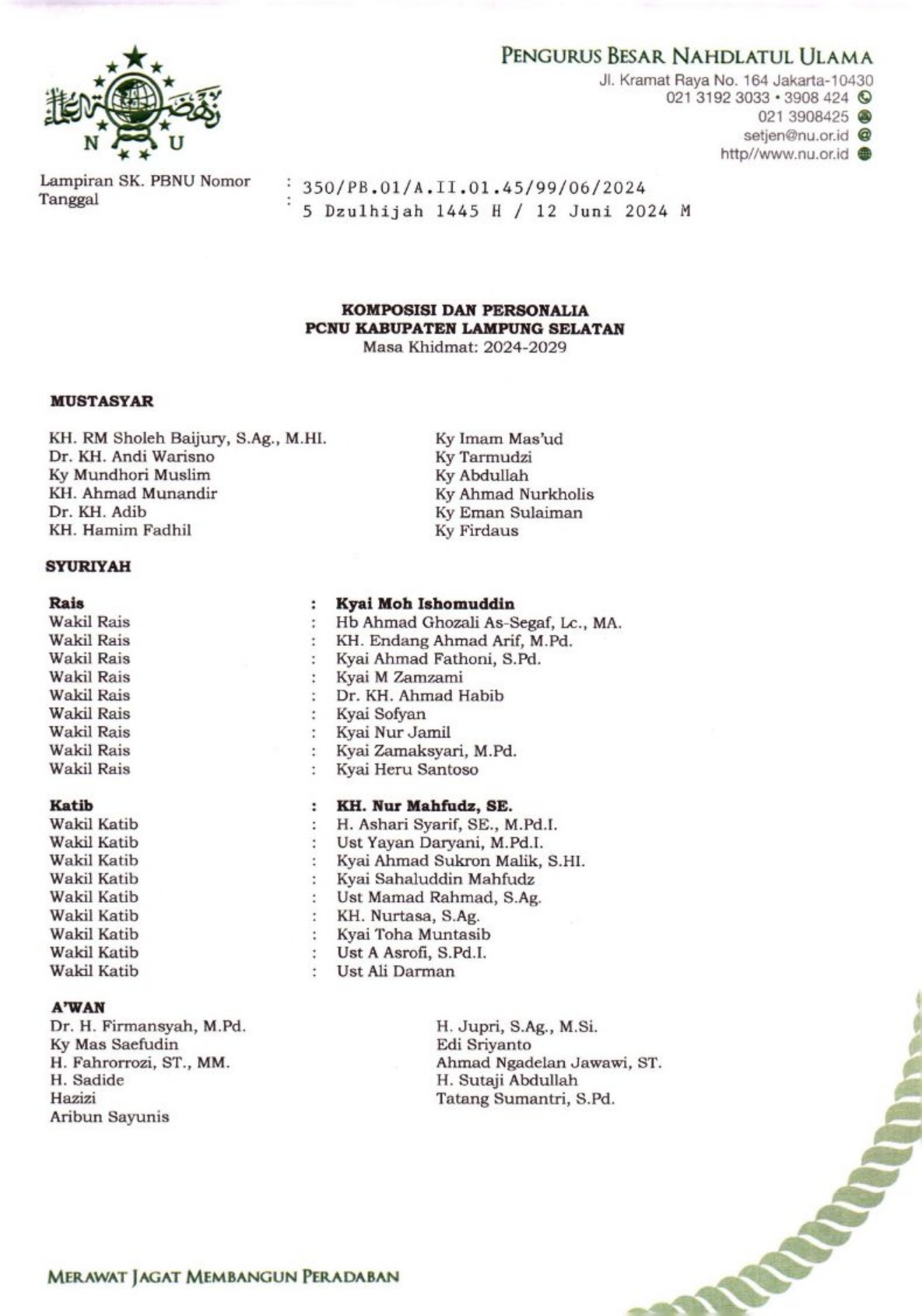 SK Pengurus PCNU Kabupaten Pusat Periode 2024-2029